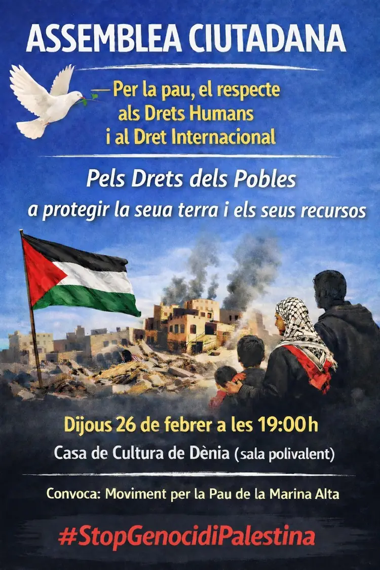 24/02/2026 El Moviment per la Pau de la Marina Alta ha convocado a asociaciones, colectivos y ciudadanía en general a participar en una asamblea ciudadana que tendrá lugar el jueves 26 de febrero, a las 19 horas, en la sala polivalente de la Casa de la Cultura de Dénia. La convocatoria se realiza, según el colectivo, en un contexto internacional que consideran de especial gravedad, marcado por recientes acuerdos y decisiones políticas que, a su juicio, están legitimando intervenciones militares, vulneraciones del derecho internacional y graves violaciones de los derechos humanos. Moviment per la Pau alerta de una escalada de conflictos y de un cambio en las relaciones internacionales que califican de preocupante, con consecuencias directas sobre pueblos, territorios y ecosistemas.