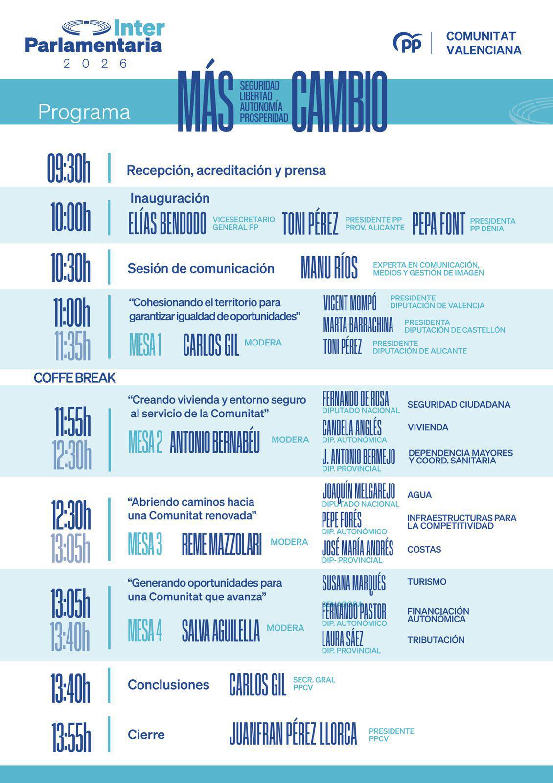 Las conclusiones correrán a cargo del secretario general del PPCV, Carlos Gil, a las 13.40 horas. La jornada será clausurada a las 13.55 horas por el presidente del PPCV, Juanfran Pérez Llorca, quien pondrá el broche final a un encuentro centrado en reforzar la coordinación institucional y avanzar en el proyecto político del partido en la Comunitat Valenciana.