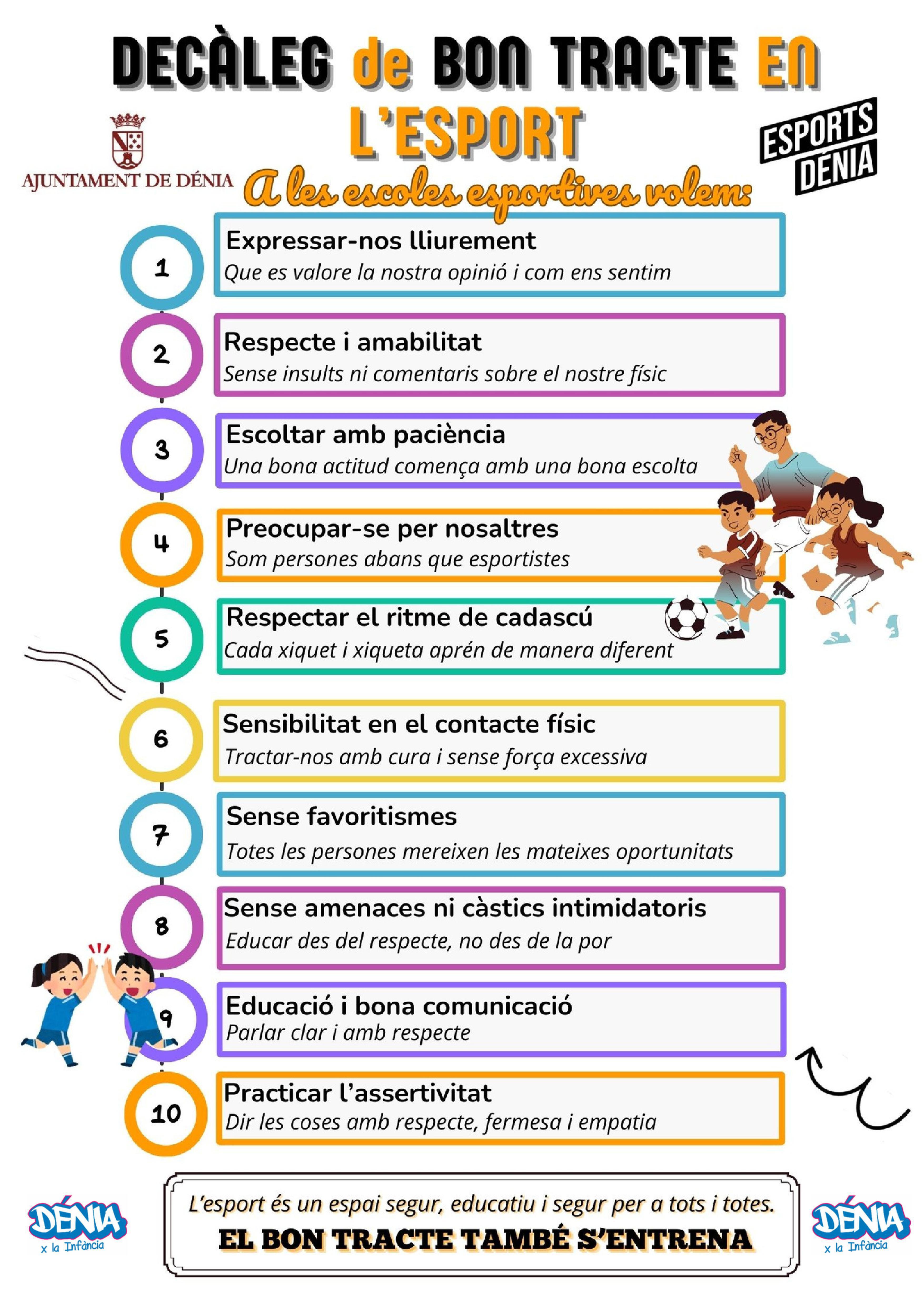 Este decálogo recuerda que el deporte va más allá de la competición: es un espacio para aprender, crecer y sentirse parte de un equipo. Con esta iniciativa, los niños y niñas de Dénia lanzan un mensaje claro: el deporte debe ser un entorno seguro, inclusivo y educativo, donde el buen trato también se entrena.