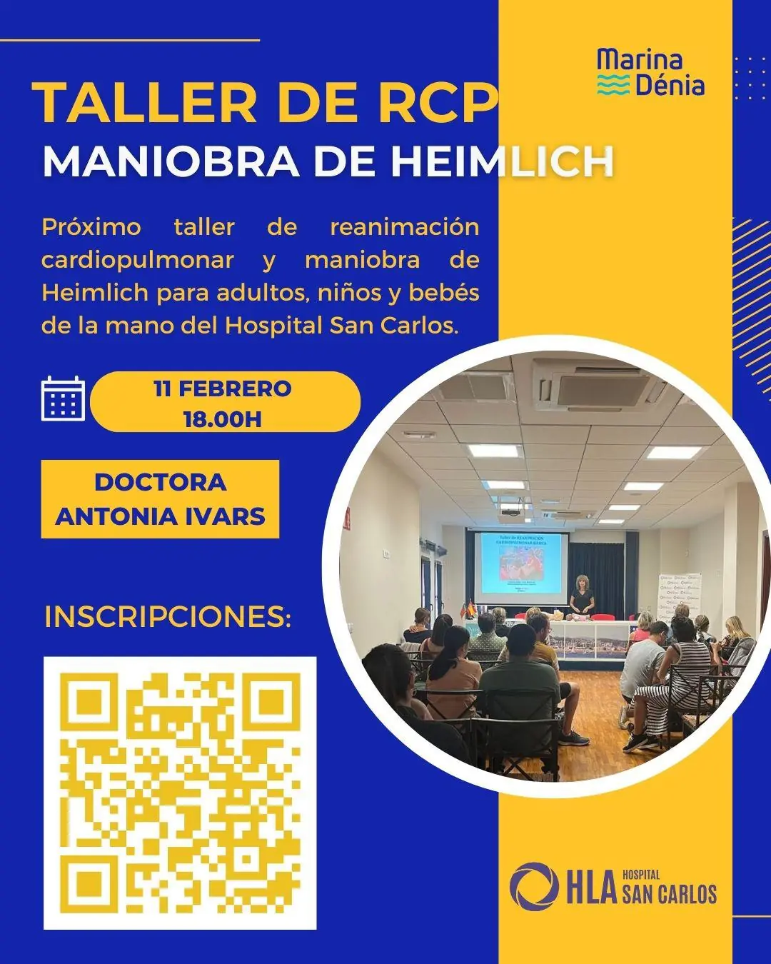 Este miércoles 11 de febrero, a las 18 horas, tendrá lugar el primer taller de Reanimación Cardiopulmonar (RCP) y Maniobra de Heimlich del año 2026, dirigido a adultos, niños y bebés. La actividad se celebrará en las instalaciones del Puerto Deportivo y Turístico Marina Dénia y contará con un aforo máximo de 30 personas.