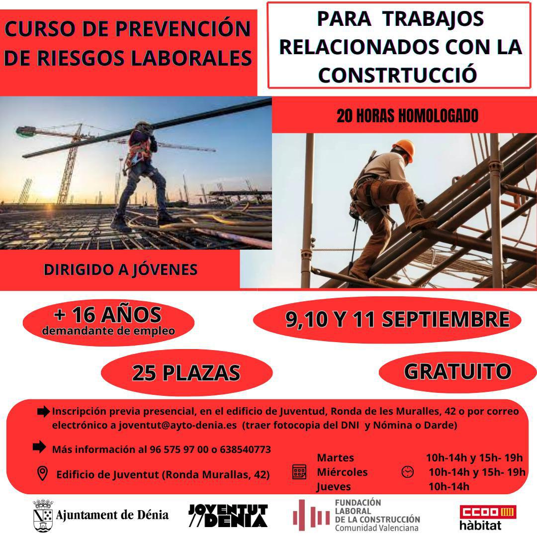 La Regidoria de Joventut de l’Ajuntament de Dénia ha posat en marxa una nova iniciativa formativa per a joves desocupats amb interès en el sector de la construcció. En col·laboració amb Hàbitat Alacant – Comissions Obreres del País Valencià, s’impartirà un curs homologat de Prevenció de Riscos Laborals de 20 hores de duració.