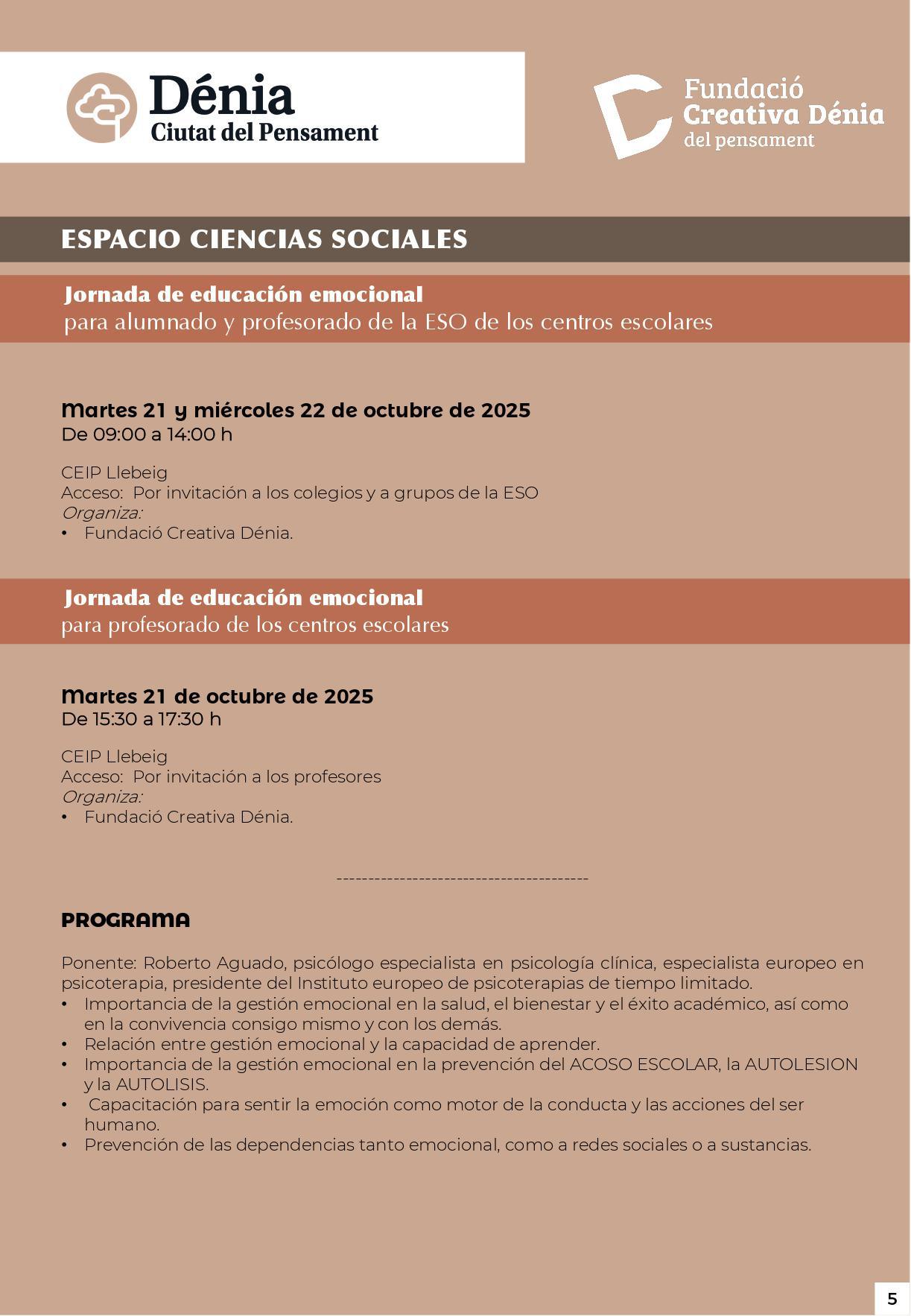 Dentro del bloque de Ciencias Sociales, los días 21 y 22 de octubre se celebrará en el colegio Llebeig la Jornada de educación emocional, dirigida a estudiantes y docentes de ESO, con la participación del psicólogo clínico Roberto Aguado, quien abordará la gestión emocional como herramienta para el bienestar, el aprendizaje y la prevención del acoso y la autolesión.