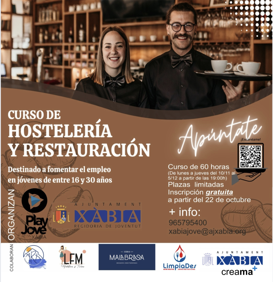 El Ayuntamiento de Xàbia, a través de la concejalía de Juventud y Formación, Creama y Play Jove ha anunciado la puesta en marcha de un curso gratuito de Hostelería y Restauración, pensado para jóvenes de entre 16 y 30 años que quieran iniciarse o mejorar sus conocimientos en uno de los sectores más importantes de la economía local.