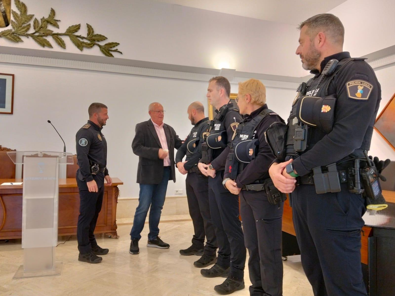 Al acabar el acto de presentación, el alcalde, Vicent Grimalt, ha hecho entrega de la divisa que lucirán los miembros de la unidad en su jefe y los tres agentes que lo acompañaban en representación del grupo.