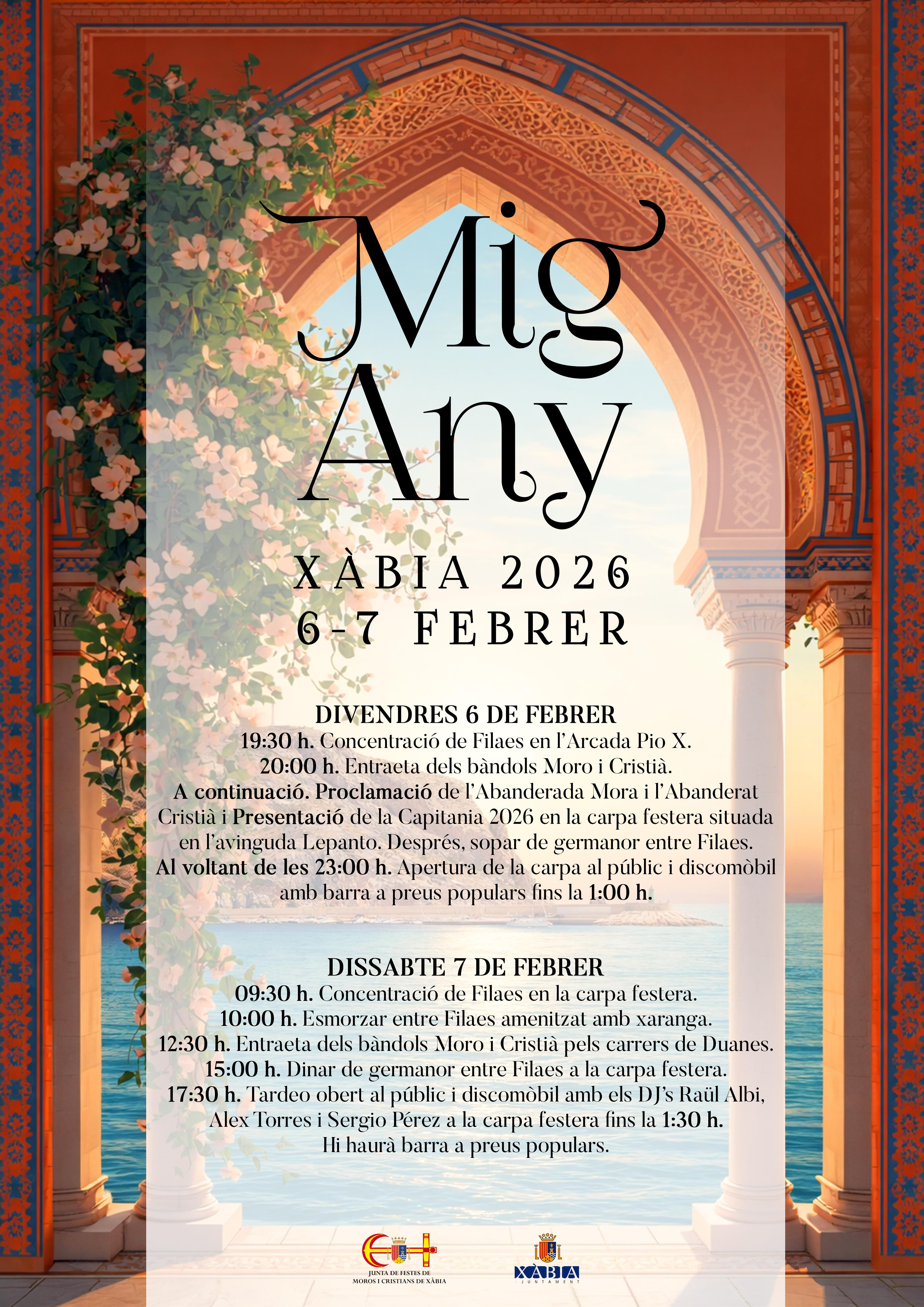 Este año, la proclamación de la Abanderada Mora, Aroa Sánchez Lora, y del Abanderado Cristiano, José Antonio Buigues Llidó, junto a la presentación de la Capitanía Al-Tarik’s 2026, se celebrará el viernes 6 de febrero, permitiendo que el Mig Any esté presidido desde sus inicios por los máximos representantes de la fiesta.