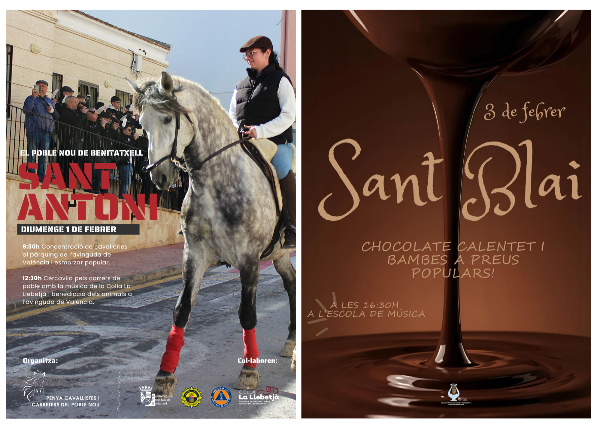 El domingo 1 de febrero, las calles del municipio se llenarán de mascotas y caballerías procedentes tanto de Benitatxell como de localidades vecinas. Como es tradición, la peña de Cavallistes i Carreters del Poble Nou de Benitatxell será la encargada de organizar los actos en honor a Sant Antoni. La jornada comenzará a las 9:30 horas con la concentración de caballos y carruajes en el aparcamiento de la avenida de València, donde se celebrará un almuerzo popular. A las 12:30 horas arrancará el pasacalle, acompañado por la Colla La Llebetjà, que conducirá hasta el acto de bendición de los animales, que tendrá lugar en la misma avenida.