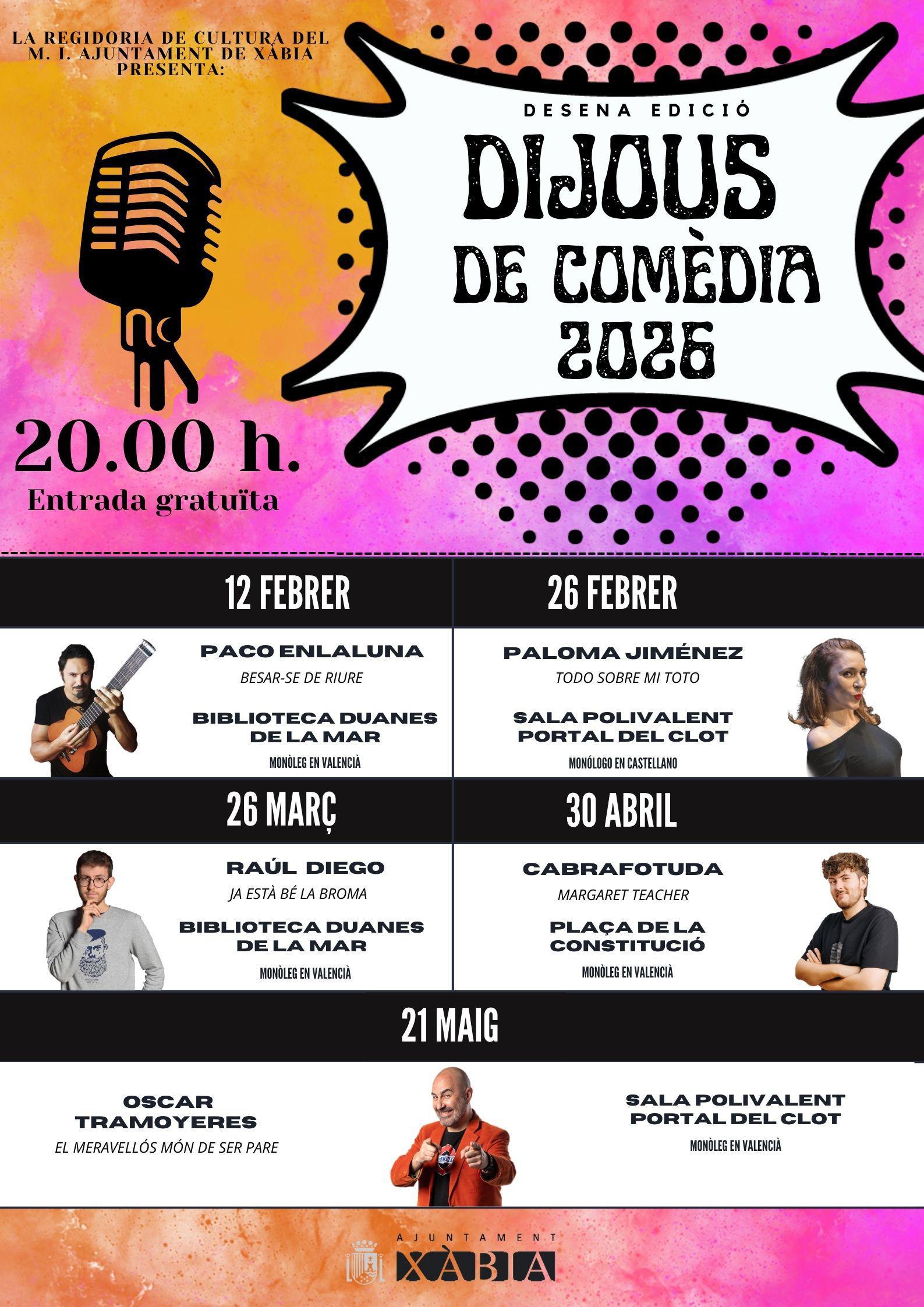 El ciclo de humor Dijous de Comèdia, una de las propuestas culturales más emblemáticas de Xàbia, celebra este año una década de sonrisas y monólogos que han marcado los jueves de la localidad. Desde su nacimiento se ha consolidado como un ciclo de monólogos y espectáculos cómicos que llenan de humor espacios de la villa como la Sala Polivalente del Portal del Clot y la Biblioteca de Duanes, con propuestas para todos los públicos y acceso gratuito.