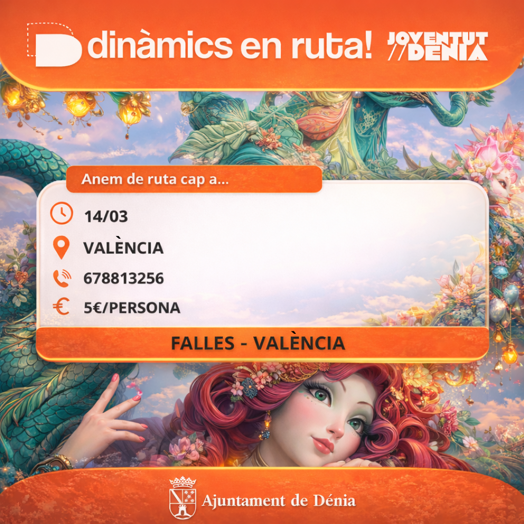 El Departamento de Juventud del Ayuntamiento de Dénia ha preparado una nueva actividad dentro del programa Dinámics en ruta!, con una salida a la ciudad de Valencia el próximo 14 de marzo para vivir de cerca las Fallas, una de las celebraciones más representativas de la Comunidad Valenciana.