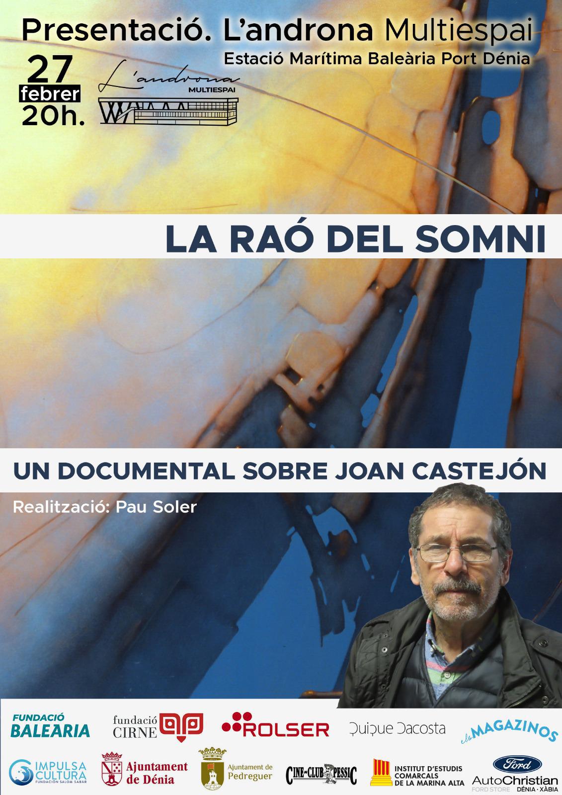 La Estació Marítima Baleària del Port de Dénia será el escenario, el próximo 27 de febrero a las 20:00 horas, de la presentación de La raó del somni, un documental centrado en la figura del artista Joan Castejón. El acto tendrá lugar en L’Androna Multiespai, espacio cultural ubicado en la Estació Marítima Baleària, consolidado como punto de encuentro para propuestas artísticas y culturales en la ciudad.
