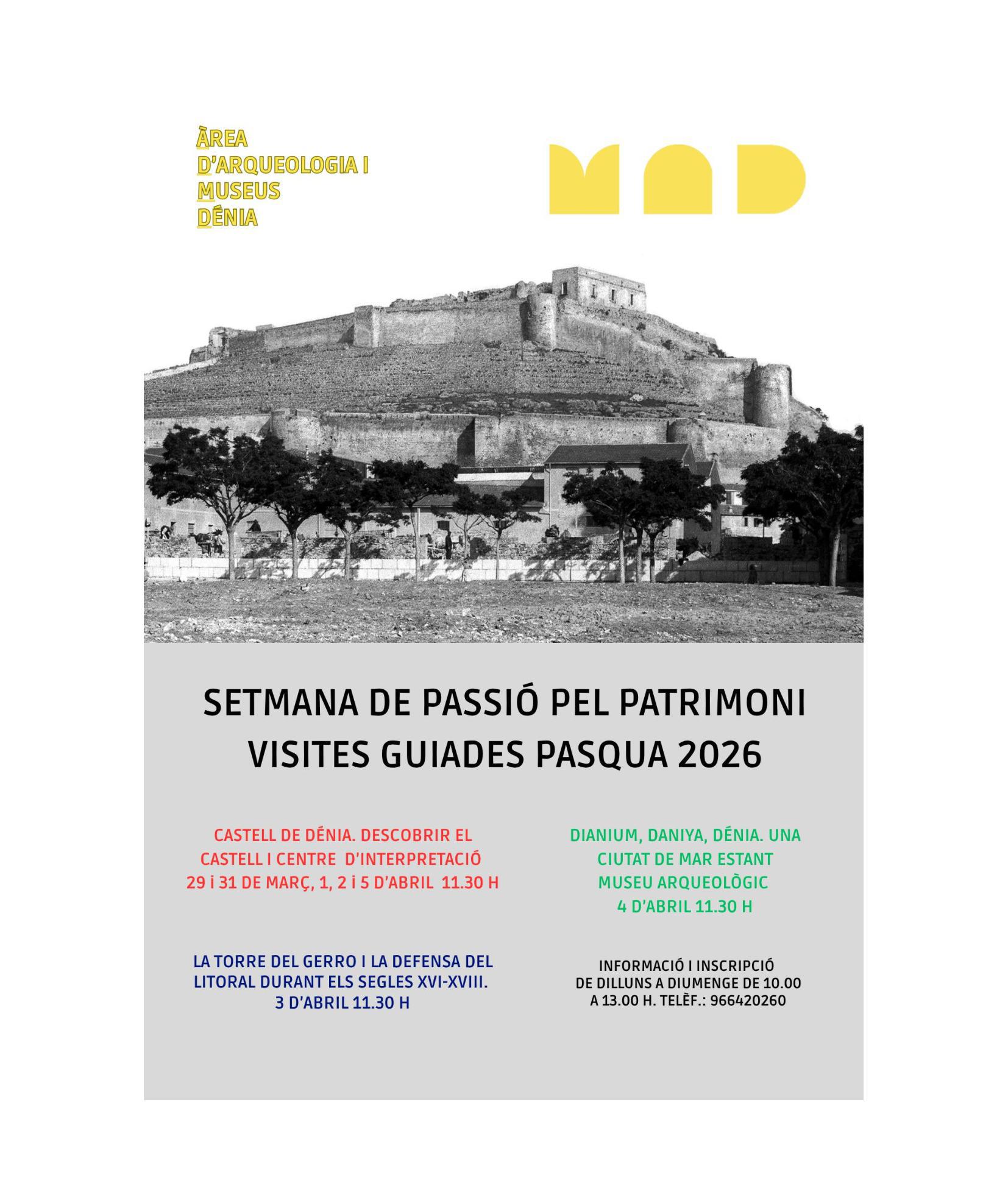 El área de Arqueología y Museos propone la iniciativa ‘Semana de pasión por el patrimonio’, con visitas guiadas gratuitas centradas en el patrimonio histórico y arqueológico de la ciudad, como el castillo, la torre del Gerro y la Dénia islámica. Para participar es necesario inscribirse previamente llamando al 96 642 02 60, en horario de 10 a 13 horas.