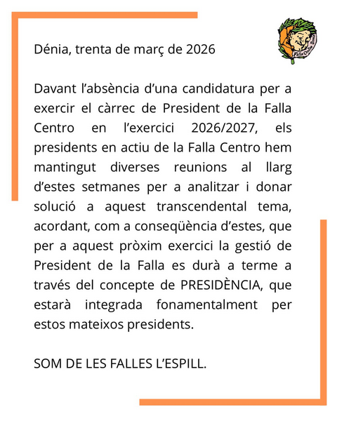 La Falla Centro de Dénia ha decidido implantar un modelo de presidencia compartida de cara al ejercicio 2026/2027, ante la ausencia de candidaturas para ocupar el cargo de presidente. Según han comunicado los actuales responsables de la comisión, durante las últimas semanas se han mantenido diversas reuniones con el objetivo de analizar la situación y buscar una solución a este asunto. Como resultado de estos encuentros, se ha acordado que la gestión de la presidencia se llevará a cabo de forma conjunta mediante el concepto de “presidencia”, que estará integrada principalmente por los actuales presidentes.