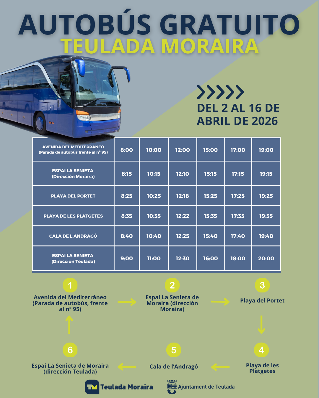 El Ayuntamiento de Teulada vuelve a poner en funcionamiento, con motivo de la Semana Santa, el servicio de autobús gratuito que conecta las principales playas y calas de Teulada Moraira. Este servicio estará operativo del 2 al 16 de abril y permitirá enlazar los dos núcleos urbanos del municipio, facilitando los desplazamientos tanto de residentes como de visitantes durante estas fechas de gran afluencia.