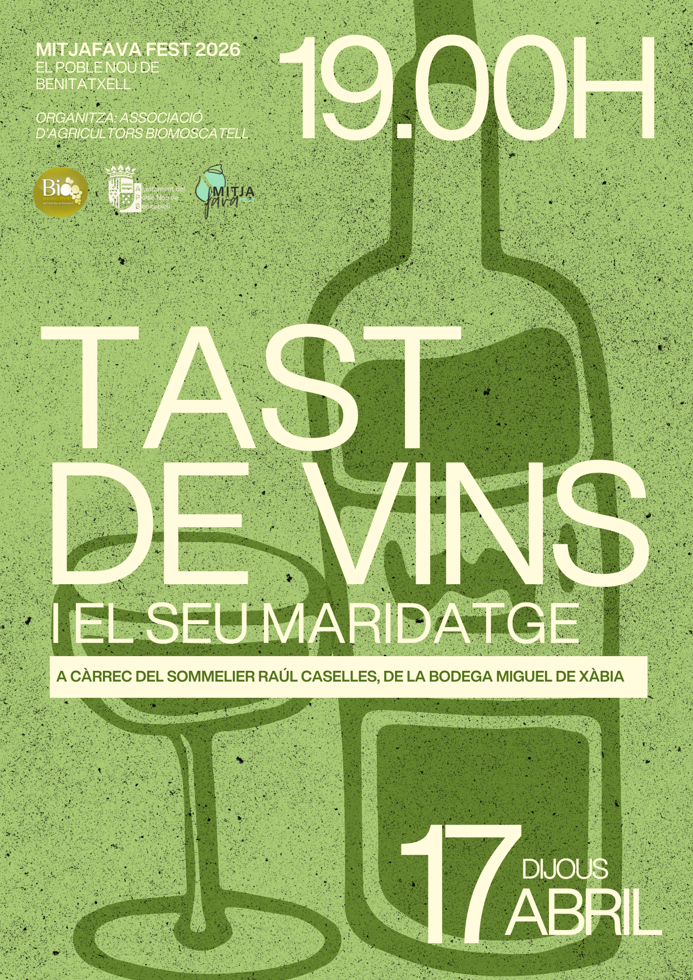 El jueves 16, a las 19:00h en el Centro Social, la Associació d’Agricultors Biomoscatell repetirá la cata de vinos con maridaje, esta vez dirigida por el sumiller Raúl Caselles, de la Bodega Miguel de Xàbia. El aforo es limitado a 35 personas y las inscripciones se abrirán la próxima semana en el portal municipal.