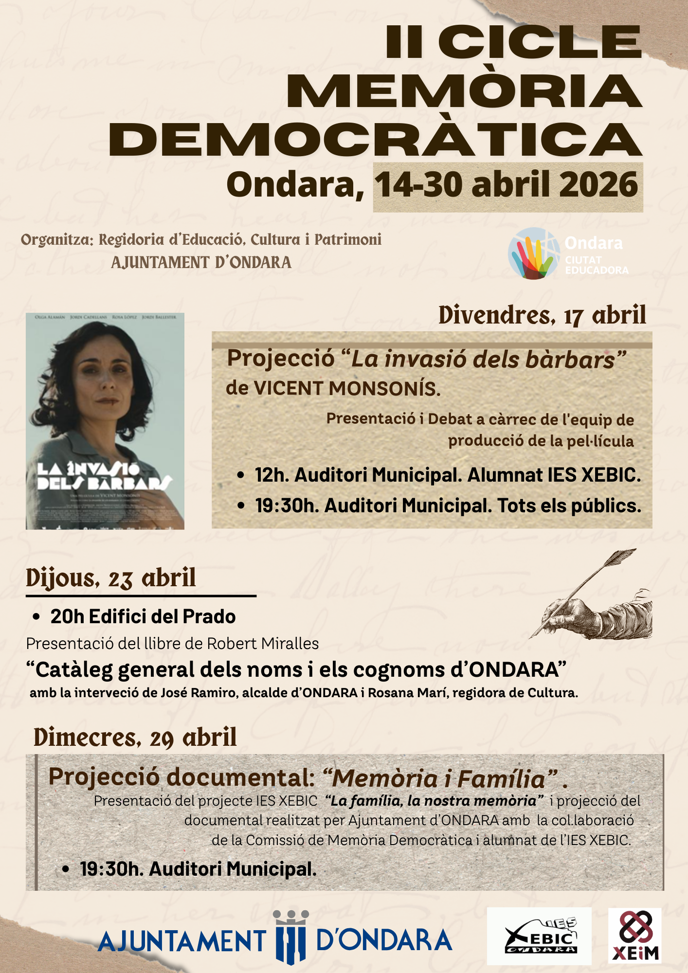 L’Ajuntament d’Ondara, mitjançant la Regidoria d’Educació, Cultura i Patrimoni, ha organitzat del 14 al 30 d’abril de 2026 el II Cicle de Memòria Democràtica, una proposta integrada en el projecte Ondara Ciutat Educadora que pretén promoure la reflexió crítica, els valors democràtics i la recuperació de la memòria històrica a través de la cultura, l’educació i la participació ciutadana.