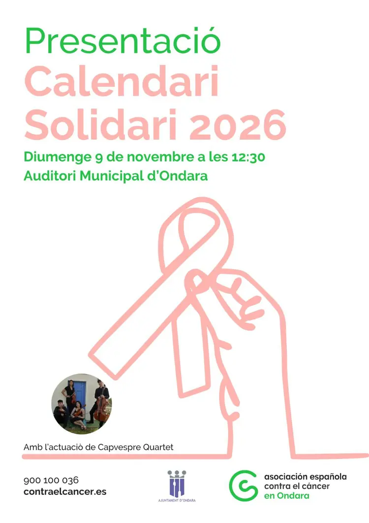 El passat diumenge, l’Auditori Municipal d’Ondara va ser l’escenari de la presentació del Calendari Solidari 2026 de la Junta Local de l’Associació Espanyola Contra el Càncer (AECC). La nova edició, amb fotografies de Joaqui Lull i Manolo Requena, torna a posar en el centre als pacients oncològics, autèntics protagonistes d’aquest projecte benèfic.